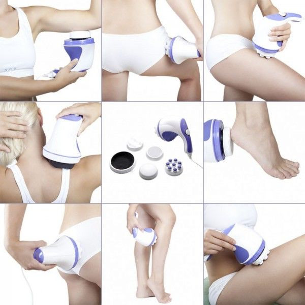 Relax Tone Spin Body Massager With 5 Headers Relax Spin Tone Slimming Lose Weight Burn Fat Full Body Massage Device BODY MASSAGER /Body Massager Massage,Handheld massager The body massager has stylish, lightweight design. It is a very powerful and quiet body massager. The body massager not only provides an exercising effect. It also soothes and relax aching muscles due to prolong standing and sitting. The body massager may be use on the waistline, neck shoulder, arm, hip, thigh and calf areas. The body massager provides you with an easy way to exercise and relax at the same time. Engineered and designed to conform to the bodies curves. Unique rapid rotation and powerful massage takes away aches and pains. Light, handy, convenient. Pack it anywhere anytime to relax your muscles. Relieves pressure, restores vigor and vitality. BODY MASSAGER FEATURES: Power Speed Regulator Hand Grip Massage Head HOW TO USE BODY MASSAGER: Fitting of Mesh Cover, Wave Cap and Roller Cap Mesh cover should be used with wave cap only, do not use mesh cover with the roller cap. Mesh cover used in combination with wave cap is suitable for areas which may cause hair entanglement. Do not use the roller cap in areas which may cause hair entanglement. Operation: Insert power plug into the wall socket of compatible power source Turn the knob(Power and Speed Regulator) to start the massager Turn the Power and Speed Requlator clockwise to adjust the speed form low ~ high, turn anti-clockwise to turn off the device. After use, turn all switches to the "OFF" position and remove power plug from the wall socket. Correct use of mesh cover to ensure hair protection BODY MASSAGER TECHNICAL SPECIFICATION: Power Applied 220V 60Hz Power Consumption 25W Control Panel Dial Control Dimensions Length x Width x High: 18 x 15 x 10 cm / 4.5" x 3.75" x 2.5" Roller Head Diameter: 7.5cm/1.88"