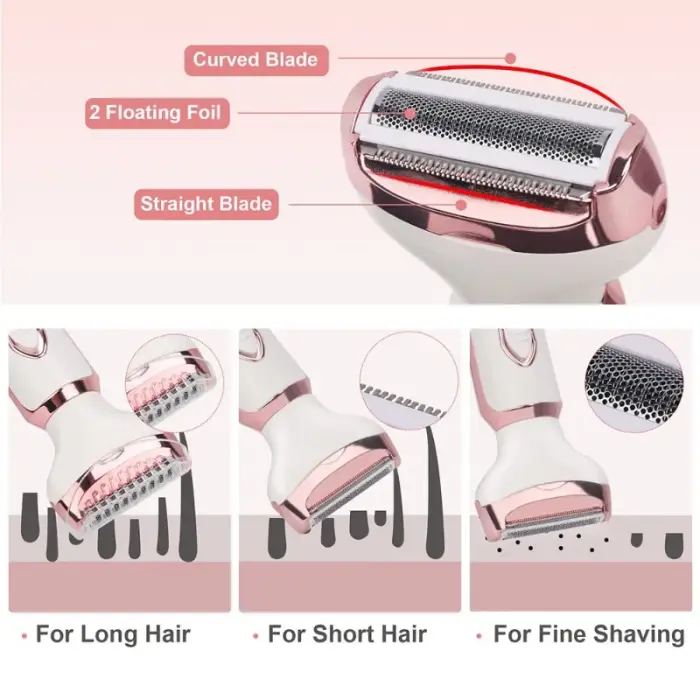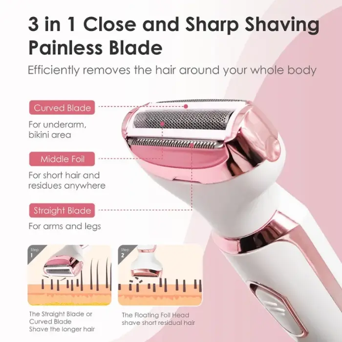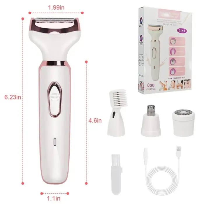 4-in-1 Women Electric Shaver – মুখ, নাক, ভ্রু, হাত, পা, আন্ডারআর্ম ও বিকিনি এরিয়ার লোম ব্যথাহীনভাবে পরিষ্কার করুন। রিচার্জেবল, পোর্টেবল ও ওয়েট/ড্রাই শেভ সাপোর্টসহ দৈনন্দিন ব্যবহারের জন্য উপযোগী।